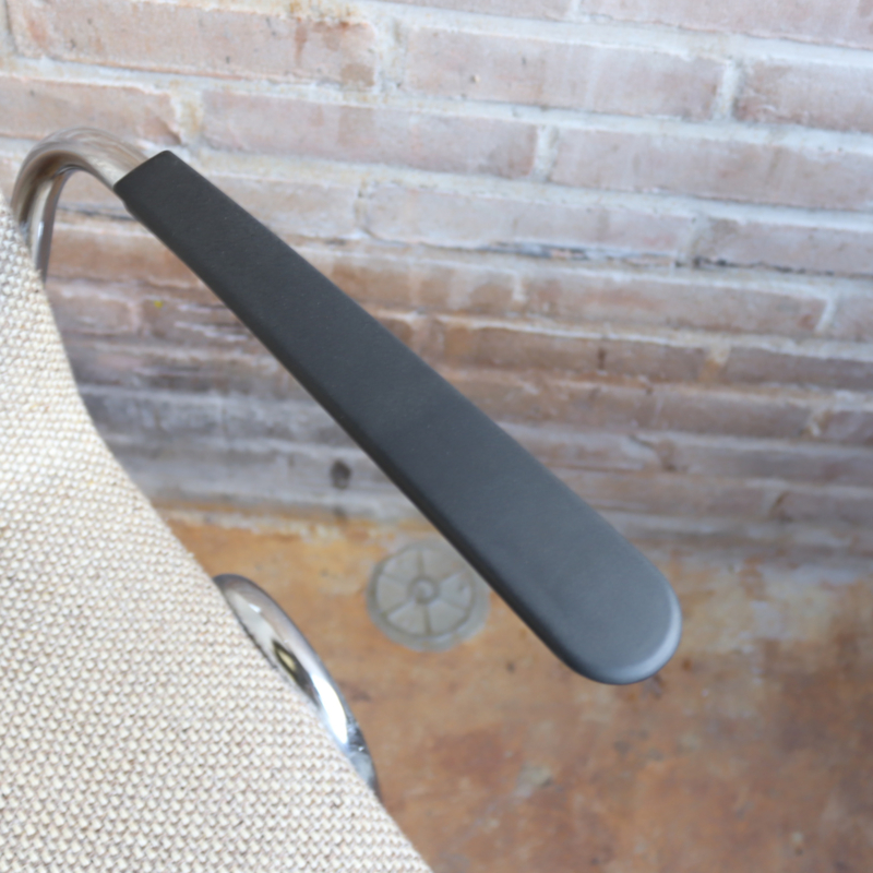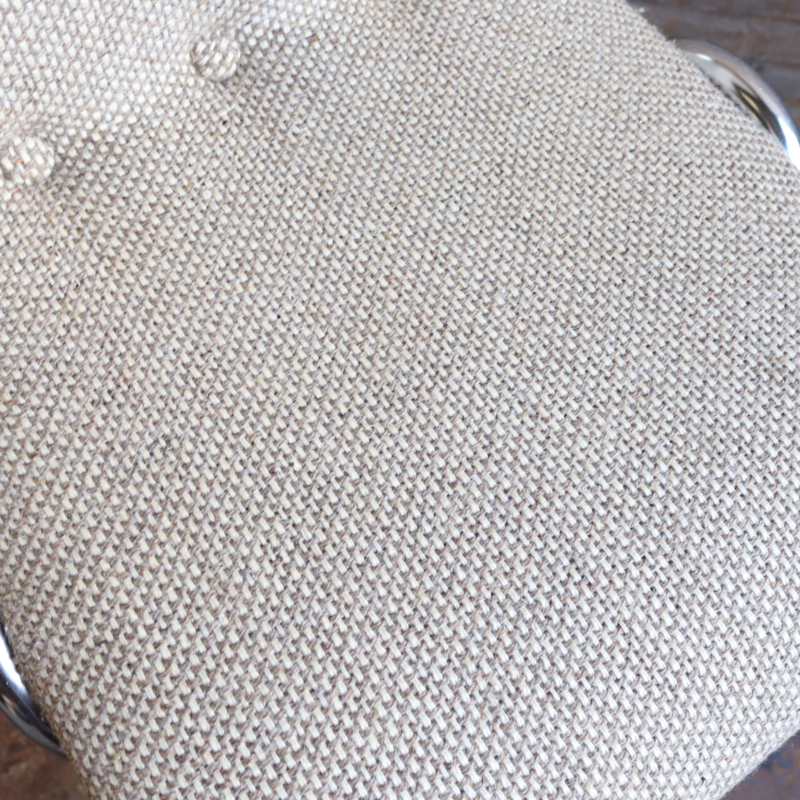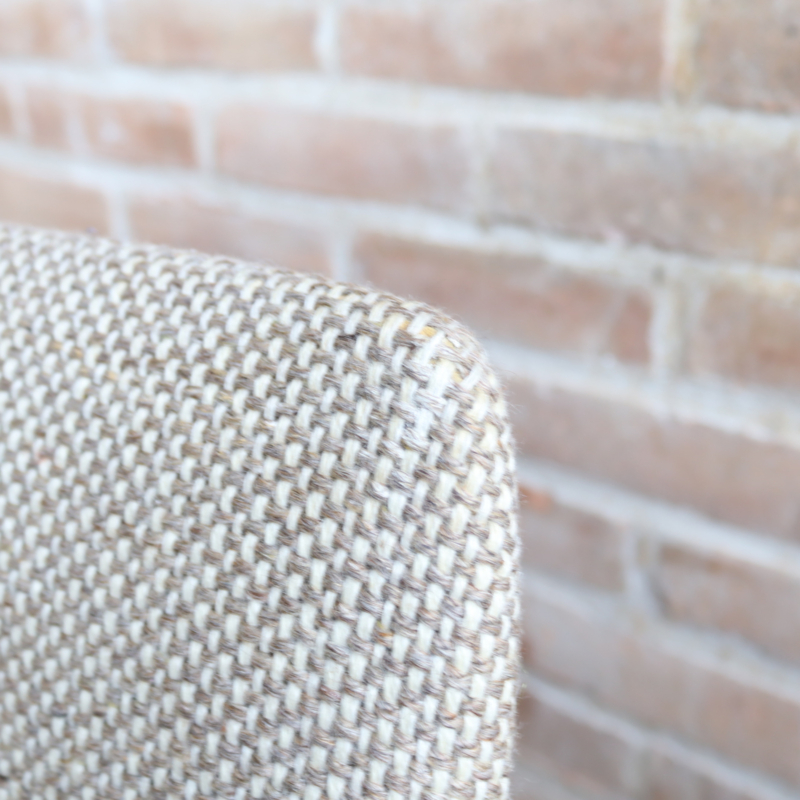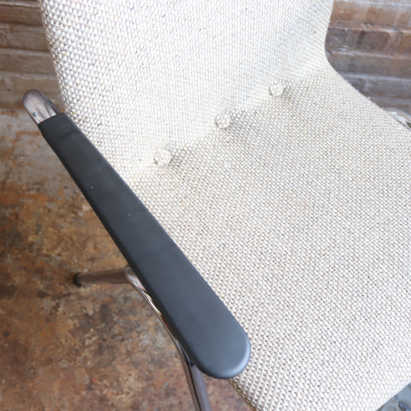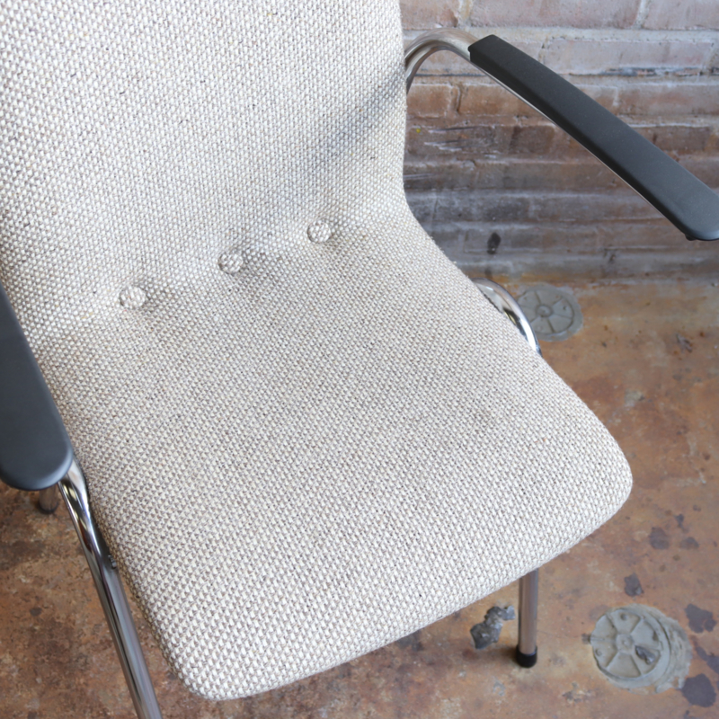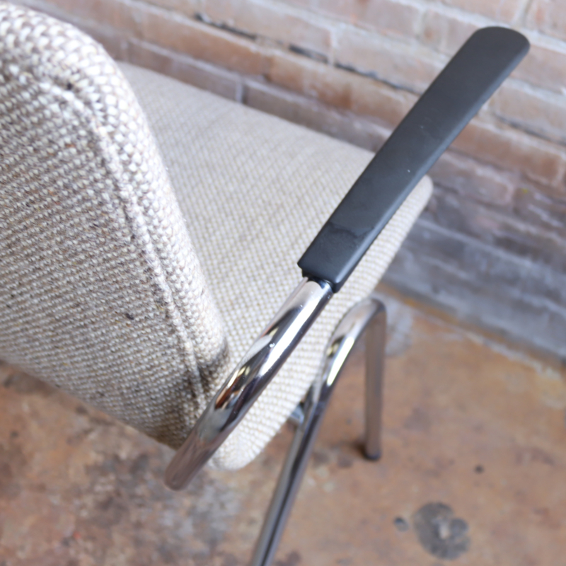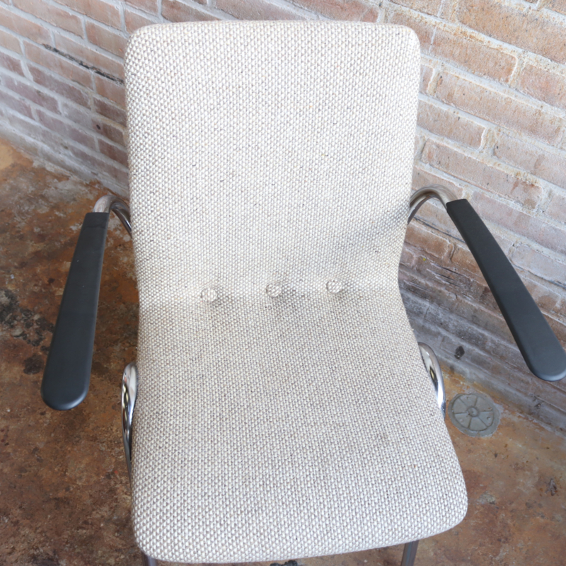 Artikelnummer: 8063 OverzichtLeuke vintage stoel met chroom buisframe en grijs / wit gemeleerde grof gewoven stof. Met zwarte armleuningen. In goede vintage staat met op de hoek een beetje slijtage dat je een klein beetje het schuim door de stof ziet komen zie foto. Er lijkt een beetje een vlekje op te zitten maar in het echt valt dat minder op.