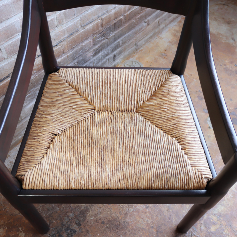 Artikelnummer: 8067 OverzichtHet ontwerp van deze houten stoel van de Italiaanse ontwerper Vico Magistretti (1920) dateert uit 1959. De stoel werd oorspronkelijk ontworpen voor het restaurant van een golf club in Italië met de naam Carimate. Goed herkenbaar aan de verdikking in de poten. Bekleed met biezen. De stoel werd zowel door Comi en Artemide (in Italië en Groot-Brittanië) als door Cassina (in Europa vanaf 1962) op de markt gebracht. Fritz Hansen bracht ter gelegenheid van de 100e geboortedag van Vico Magistretti in 2020 een nieuwe versie van de stoel uit, met wat kleine wijzigingen van rugleuning, zithoogte en bekledingsmateriaal. Dit oude model is ooit rood geweest maar is door de vorige eigenaar in een donkere kleur bruin gebeitst. In vintage staat met wat gebruiksporen aan de kleur, ik heb dit een beetje bijgewerkt zodat het minder opvalt zie foto's.