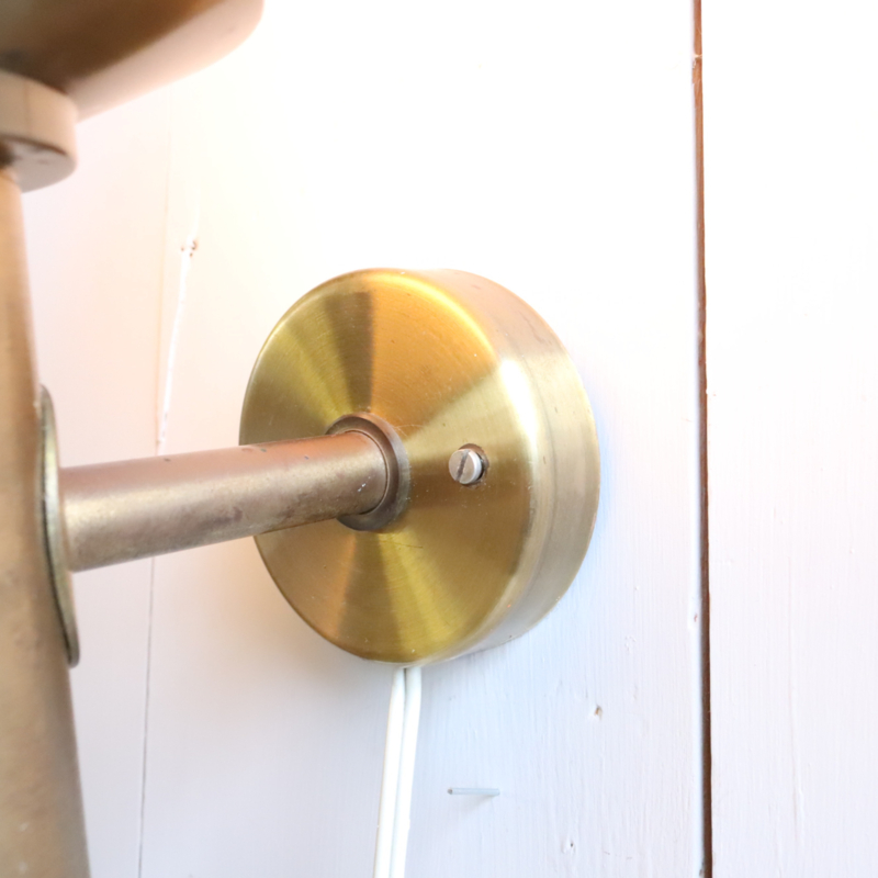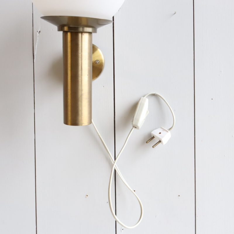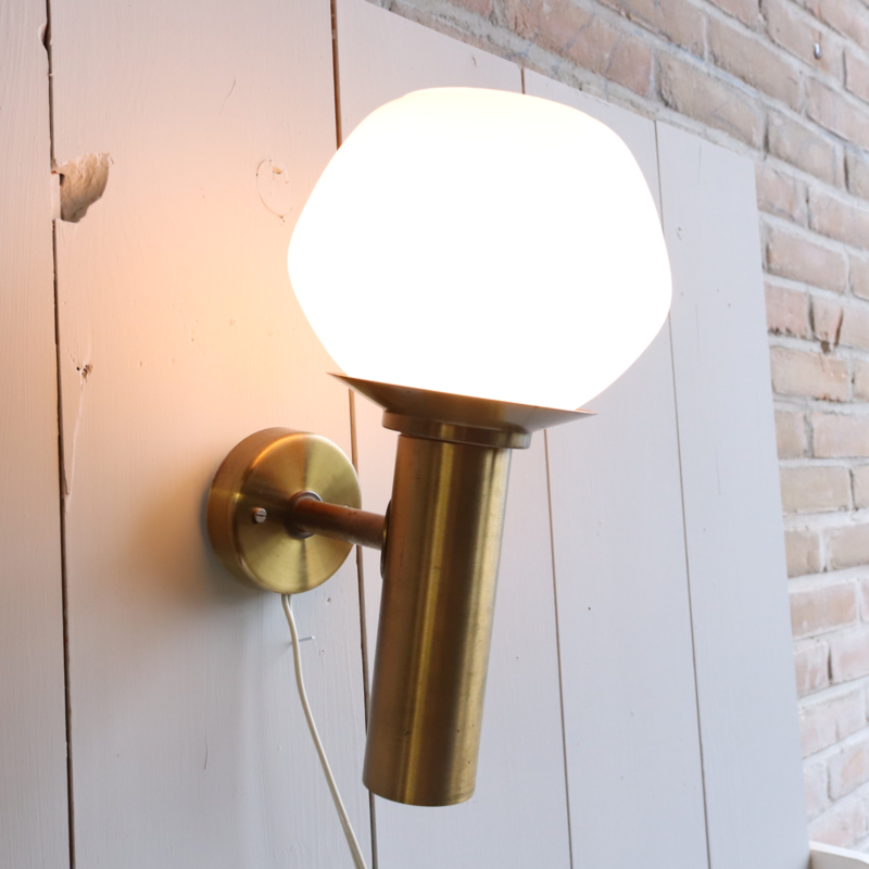 Mooie wandlamp in messing en een melk glazen kap. Met snoer en stekker. In goede vintage staat.