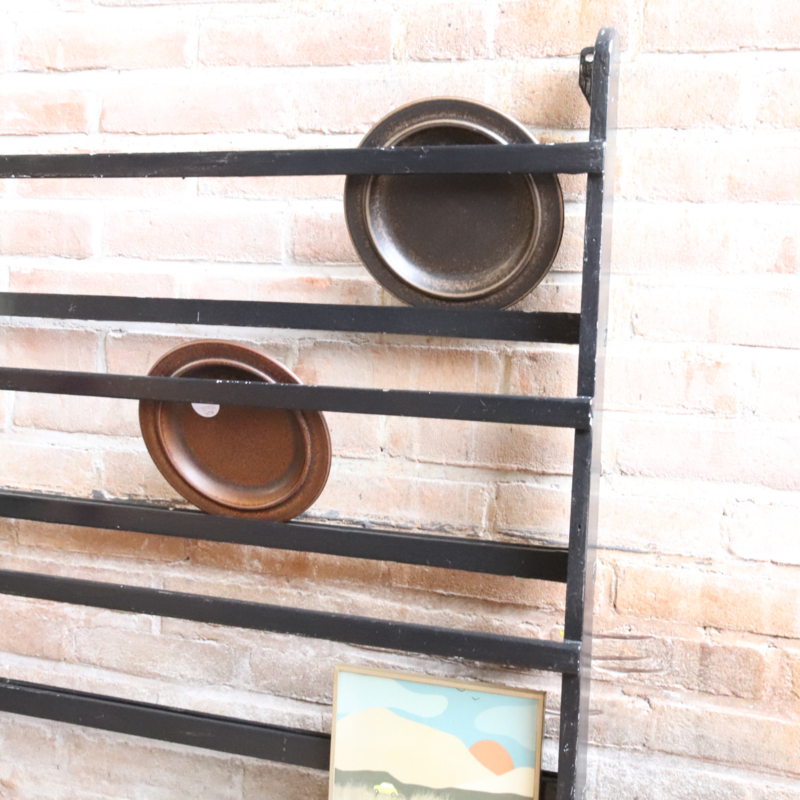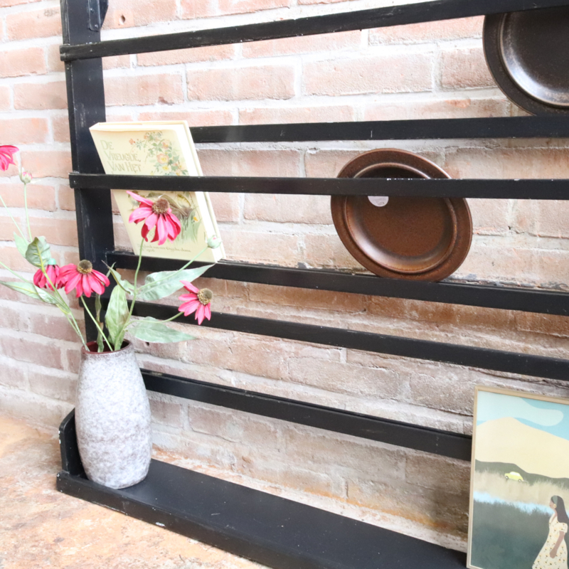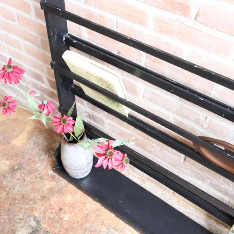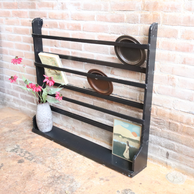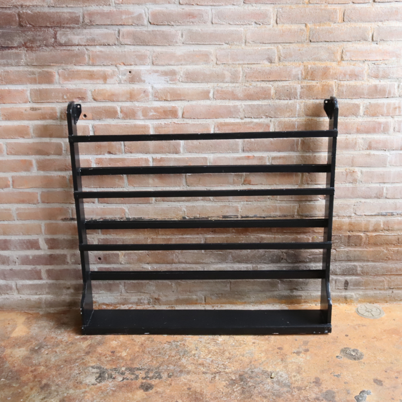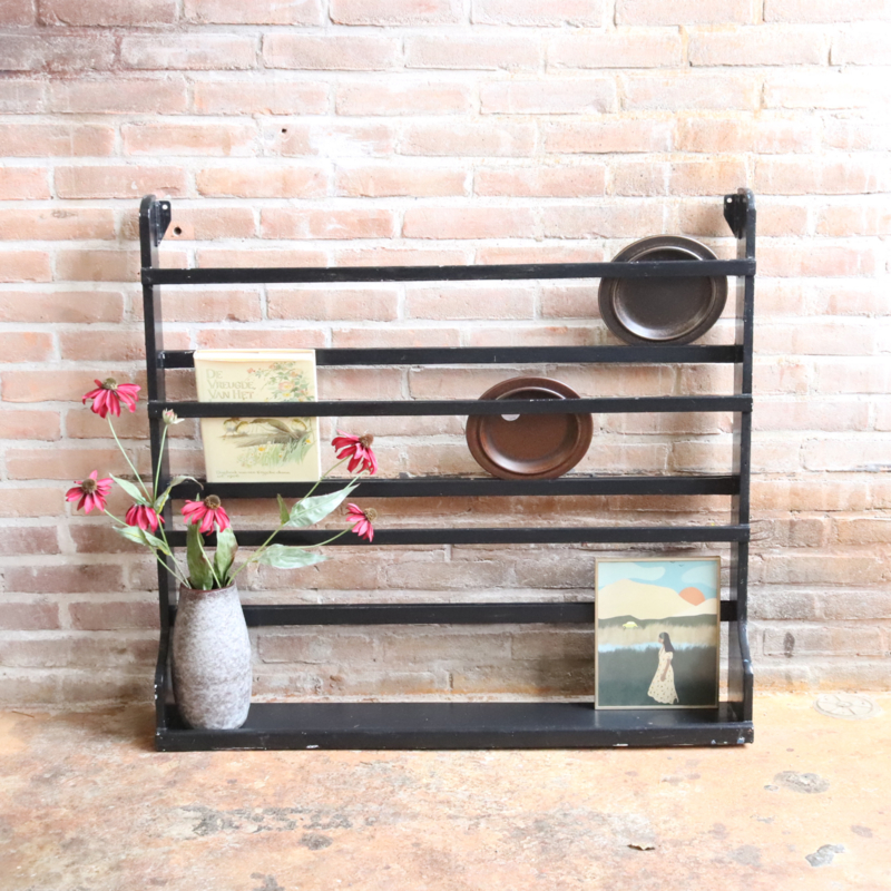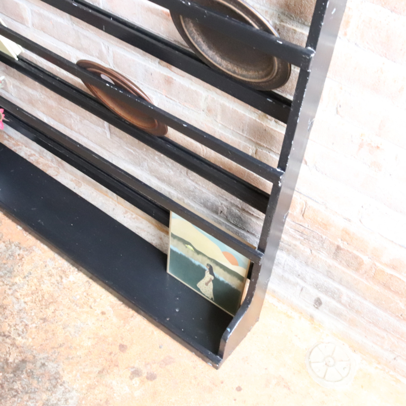 Artikelnummer: 8314 OverzichtLeuk groot vintage borden rek wat je kan gebruiken in de keuken maar ook leuk om boekjes of lijstjes in neer te zetten. Geschilderd in een zwarte kleur met wat gebruiksporen.