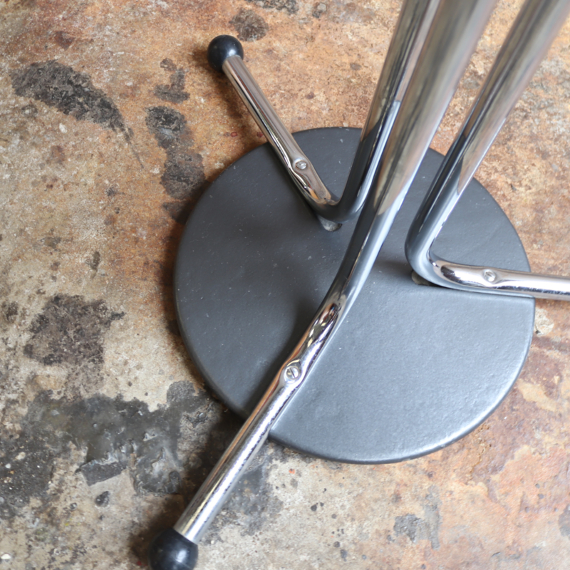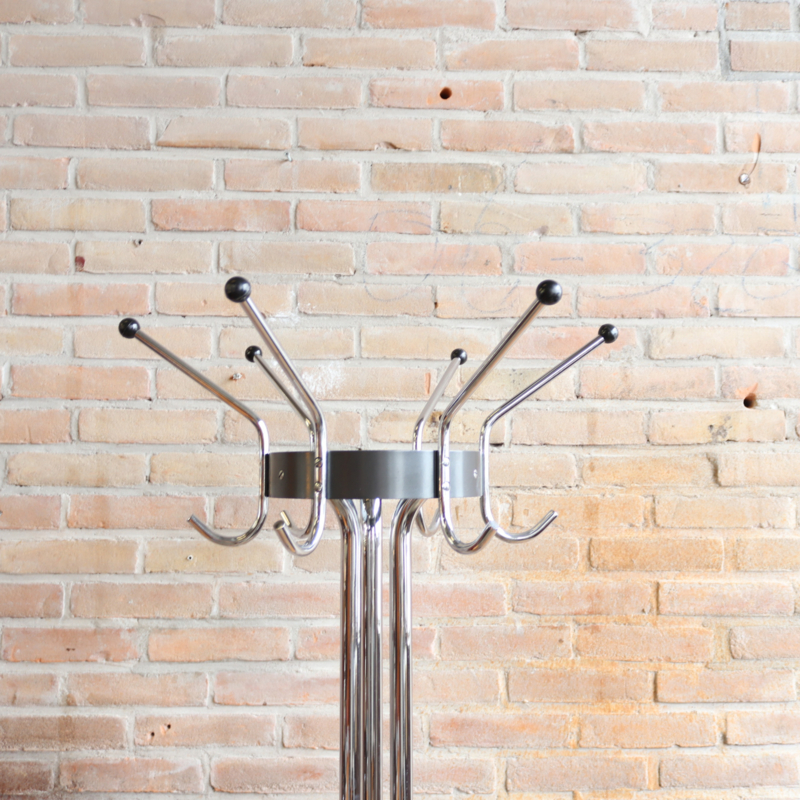 Artikelnummer: 8321 OverzichtMooie zware kwaliteit vintage design kapstok van het merk Tubax in chroom met grijze en zwarte details. In goede vintage staat met aan de bovenste ring wat gebruiksporen zie detail foto's.
