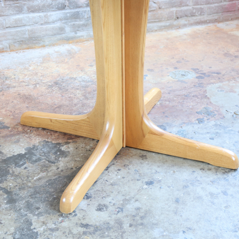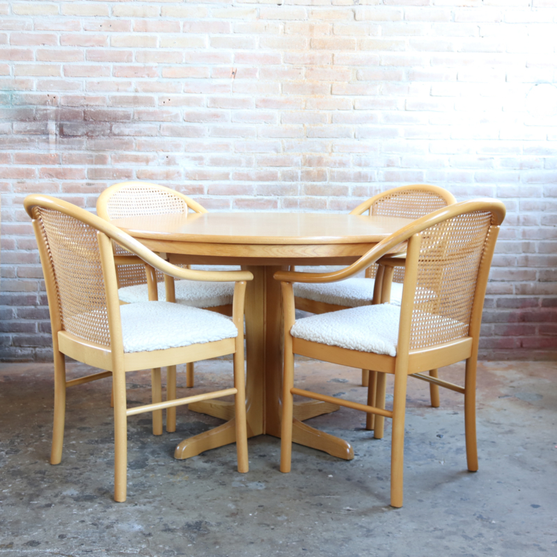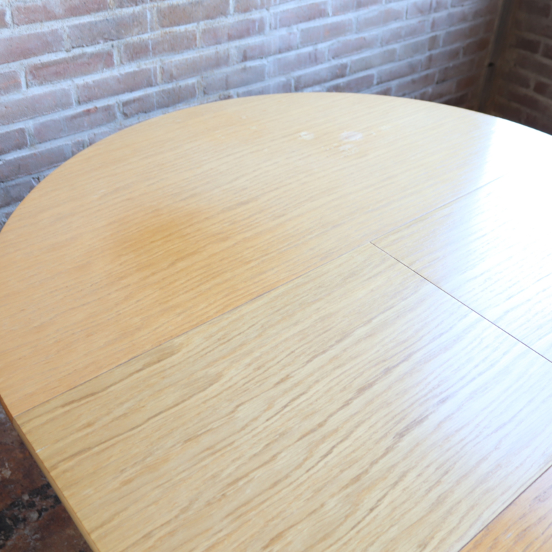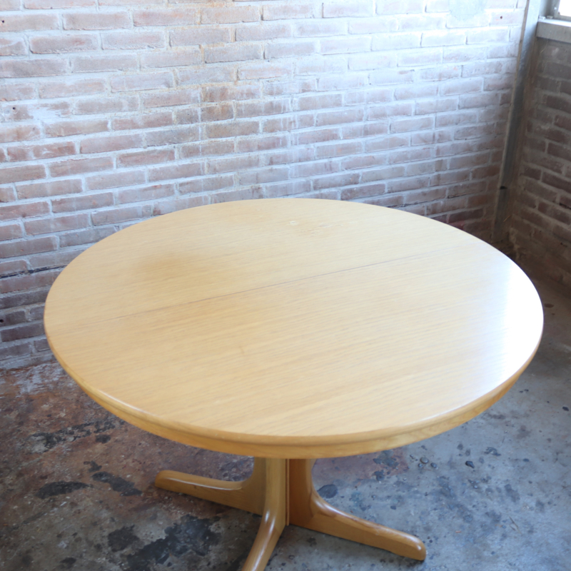 Leuke ronde tafel in een lichte kleur hout fineer met een toffe kruispoot, de tafel is ook nog heel gemakkelijk uit de trekken tot groter formaat ovaal. In vintage staat met wat gebruikporen zoals wat schade aan de lak. zie foto's