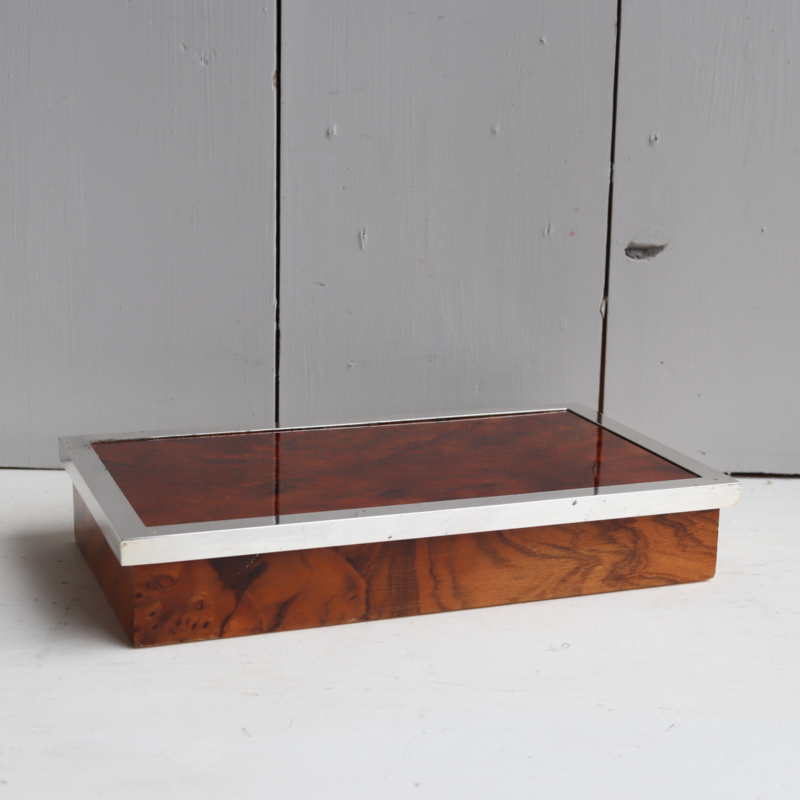Vintage sieraden kistje met wortel hout fineer en de rand is denk ik verzilverd. In goede vintge staat.