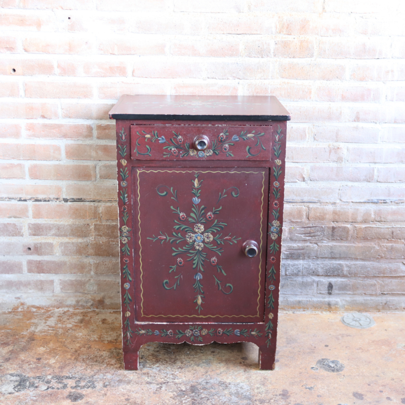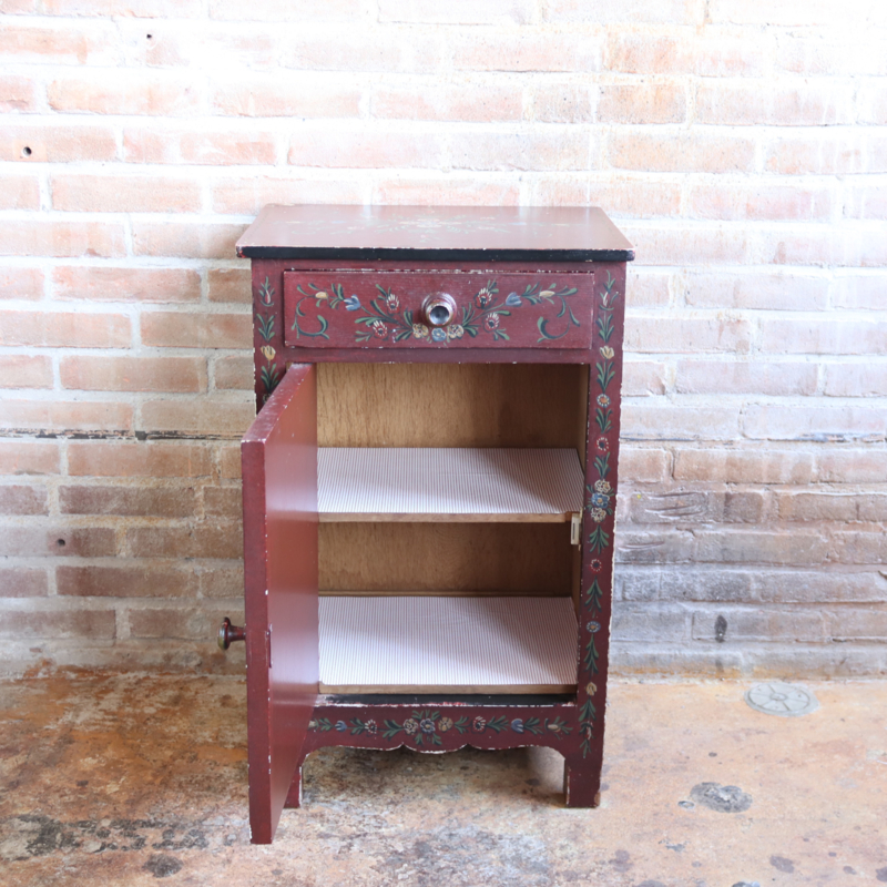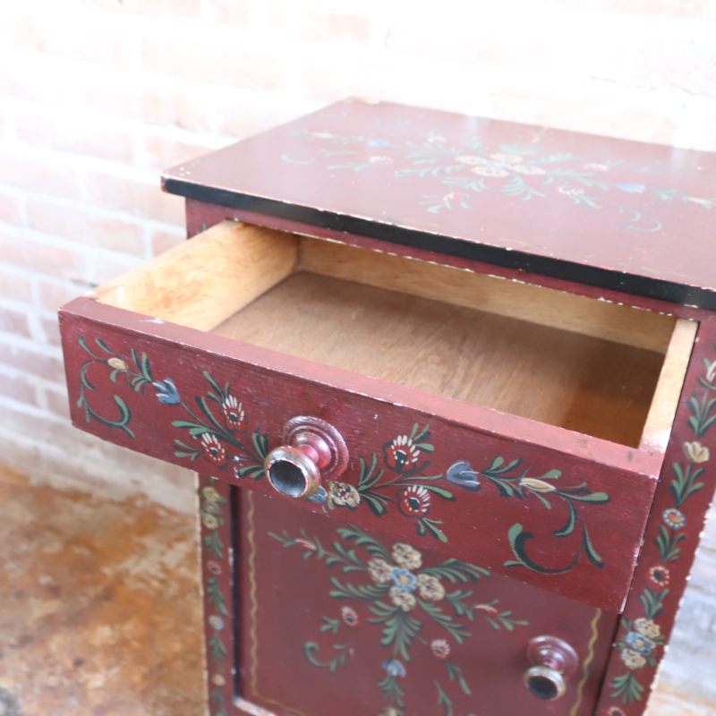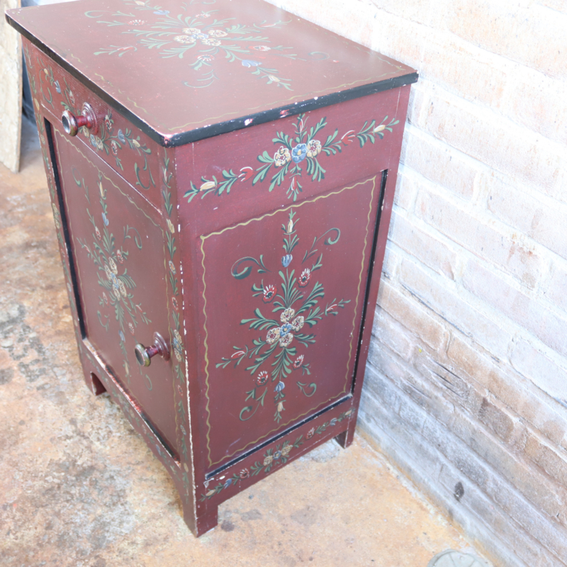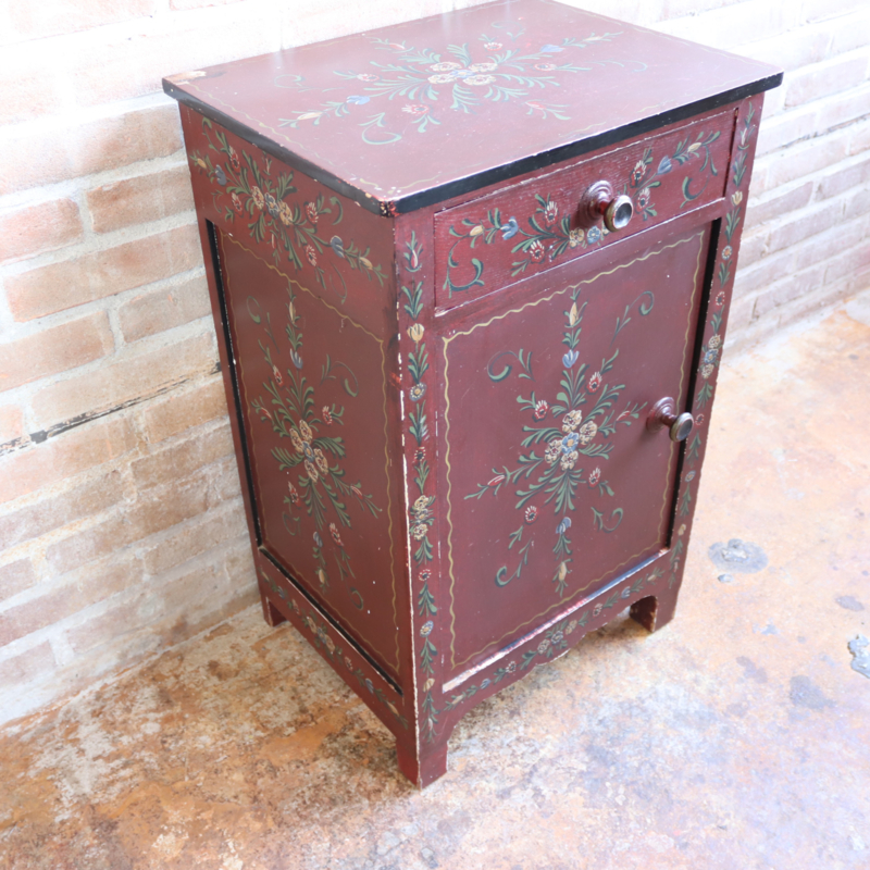 Artikelnummer: 8345 OverzichtSuper leuke vintage nachtkastje in een donker rode kleur met bloemen patroon, beetje hindeloopen stijl. Met lade en kast deurtje. In goede vintage staat met gebruikporen zie foto's. Links achterop het blad is echt een hoekje van de verf af.