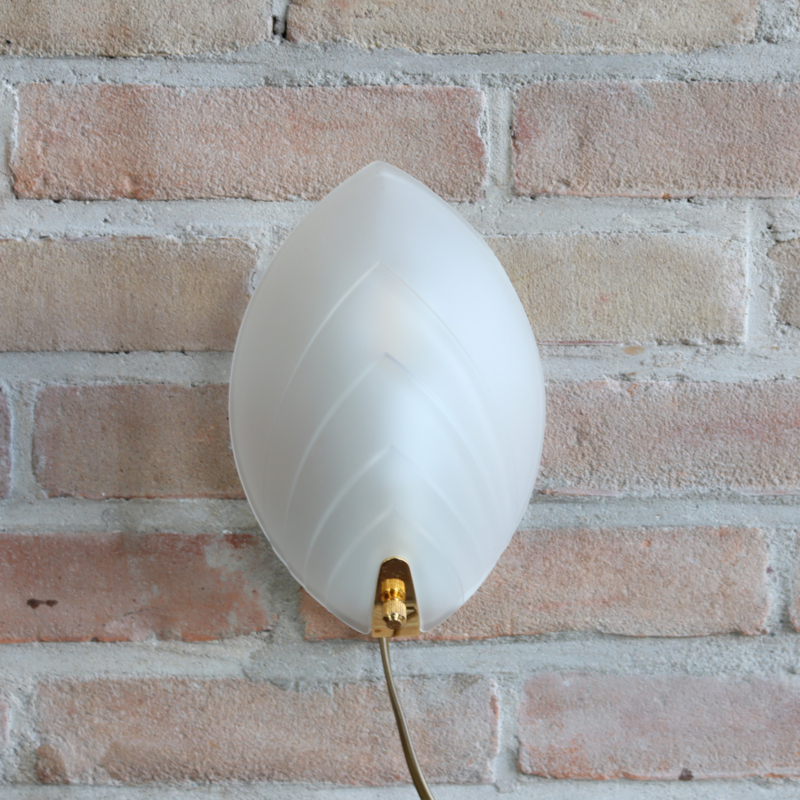Mooie wandlamp met melkglas in bladvorm met messing detail. Met snoer en stekker. In goede vintage staat.