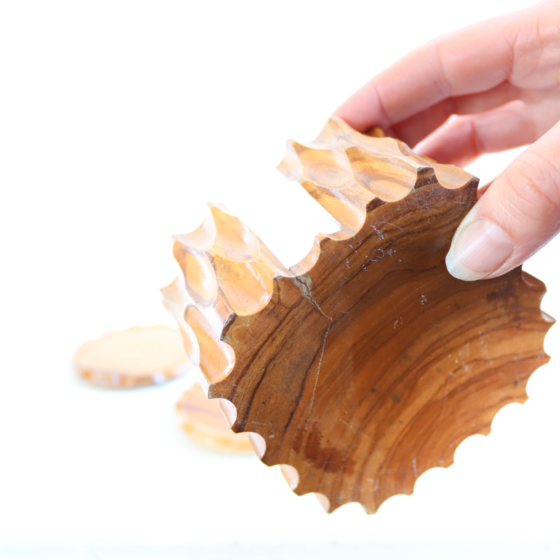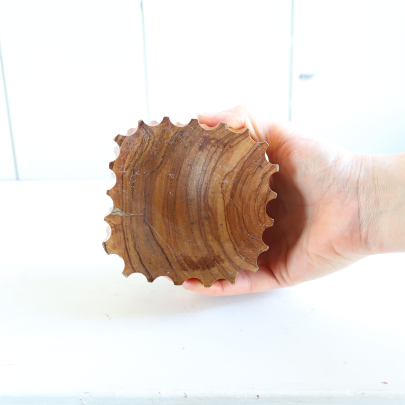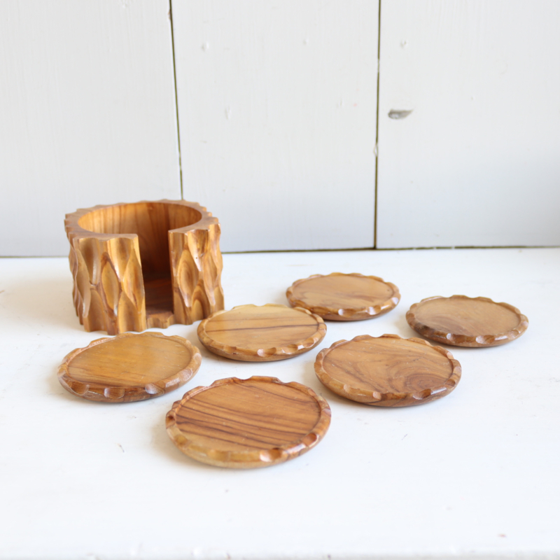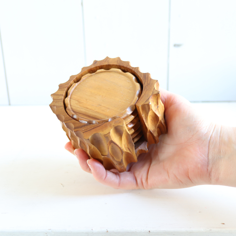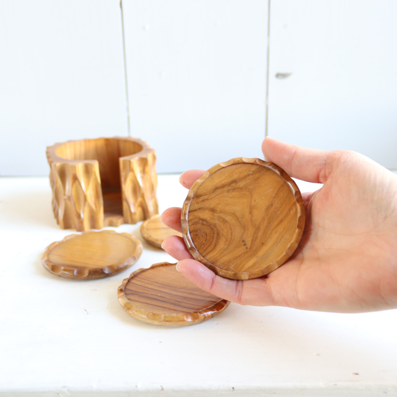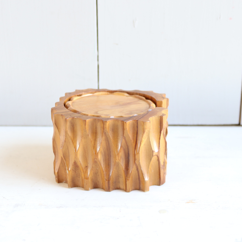 Onderzetters 6 stuks in bkakje met mooie vormgegeven hout, met klein barstje wat ik gelijmd heb. In goede vintage staat.