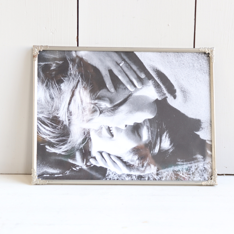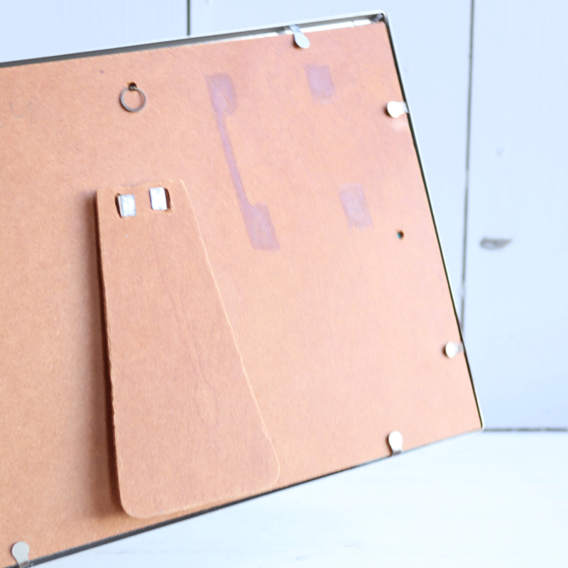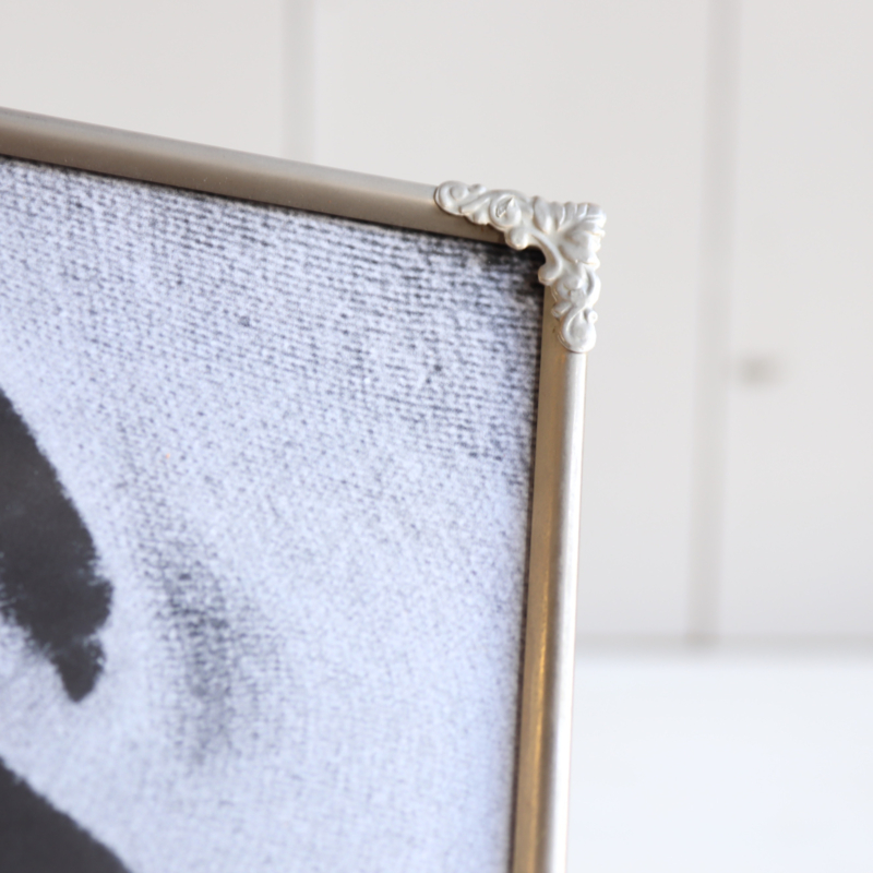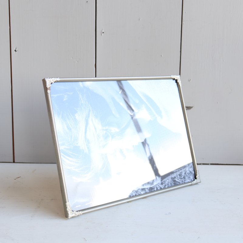 Leuk oud foto lijstje in zilver kleur / metalen rand met leuke sierhoekjes. Om neer te zetten en op te hangen In goede vintage staat.
