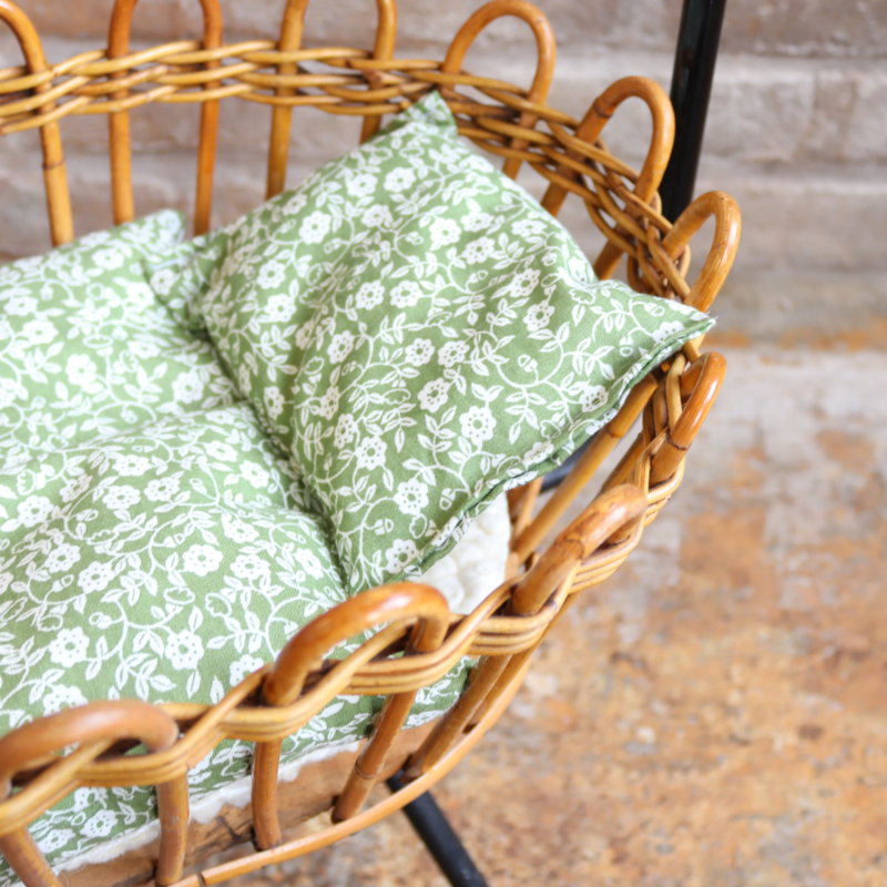 Artikelnummer: 8294 OverzichtLeuk poppenwiegje van rotan met metaal onderstel, met nieuw gemaakt beddengoed van vintage stofjes in groen met een bloementje en een wollen matrasje. In goede vintage staat.