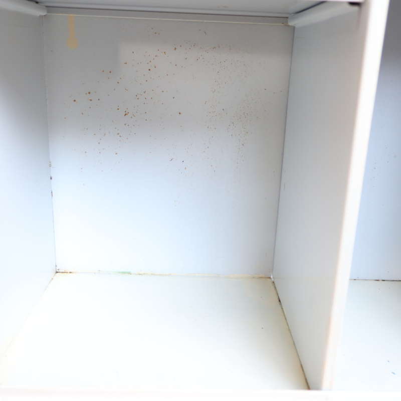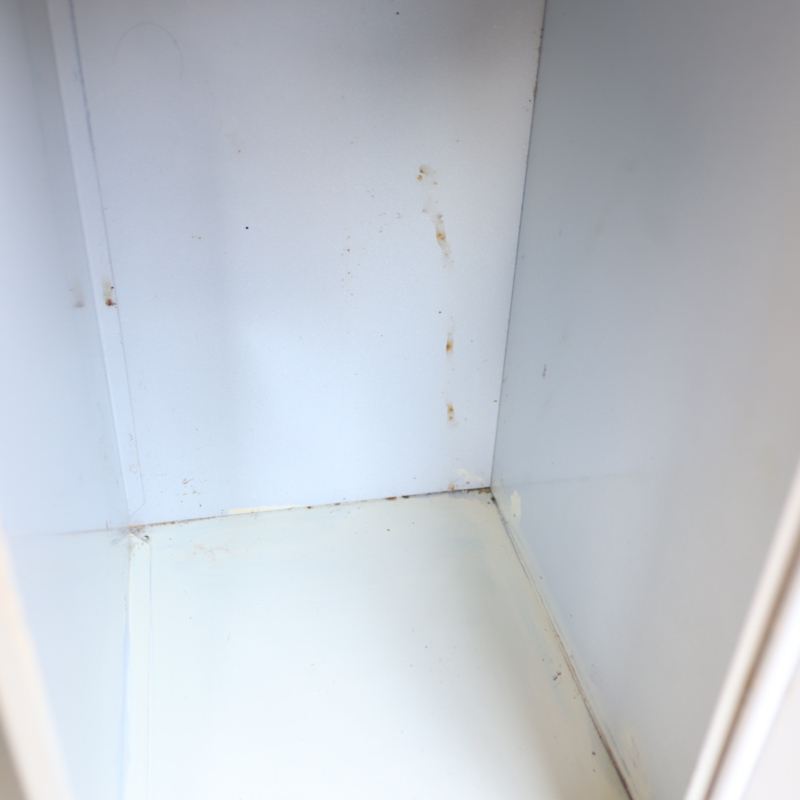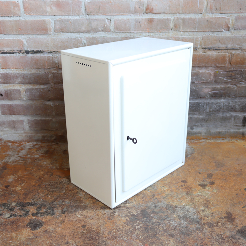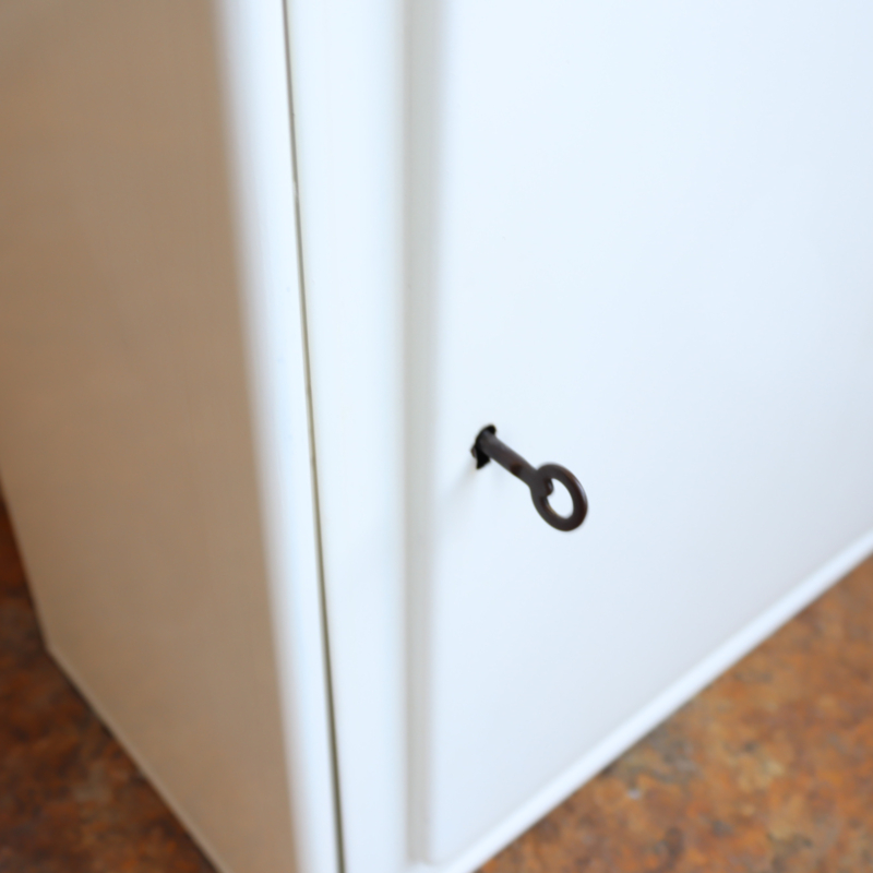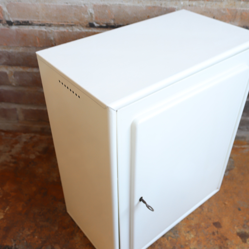 Vintage wit metaal medicijn kastje met vakjes aan de binnenkant en een sleutel. Het kastje kan je met twee schroeven ophangen aan de wand. In goede vintage staat.